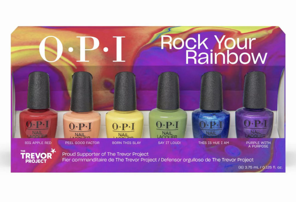 How it Gives Back: OPI is a proud partner of The Trevor Project, the leading crisis intervention organization for LGBTQIA+ youth. A portion of purchases from the Rock Your Rainbow Collection in shades of Big Apple Red, Peel Good Factor, Born This Way, Say It Loud, This Is Hue I Am and Purple With A Purpose support the cause.