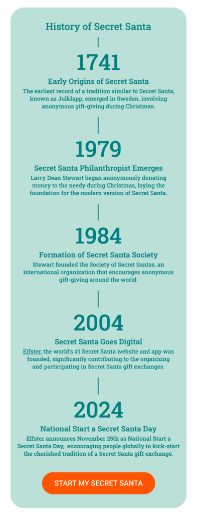 The modern American Secret Santa tradition began in 1979 when Kansas City philanthropist Larry Dean Stewart began anonymously gifting money to strangers in need, often in the form of $20, $50, or $100 bills. His selfless act of generosity laid the foundation for today’s Secret Santa. Before his passing, he established the Society of Secret Santas, an organization dedicated to spreading anonymous gift-giving worldwide and encouraging generosity without expectation of recognition.